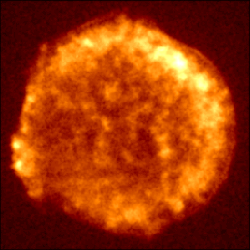 The color image above depicts the X-ray emission from the remnant of Tycho's supernova as observed in a 104,000 second long observation by the ROSAT High Resolution Imager (HRI). Most of the bright regions correspond to clumps of metal enriched material ejected from the star that exploded as a supernova over 400 years ago. This image is about five times deeper than any previous high resolution X-ray image and it reveals some new features. Most notable is the weak rim of emission seen clearly around the entire remnant, which is believed to be the blast wave propagating through the surrounding circumstellar (or interstellar) medium.