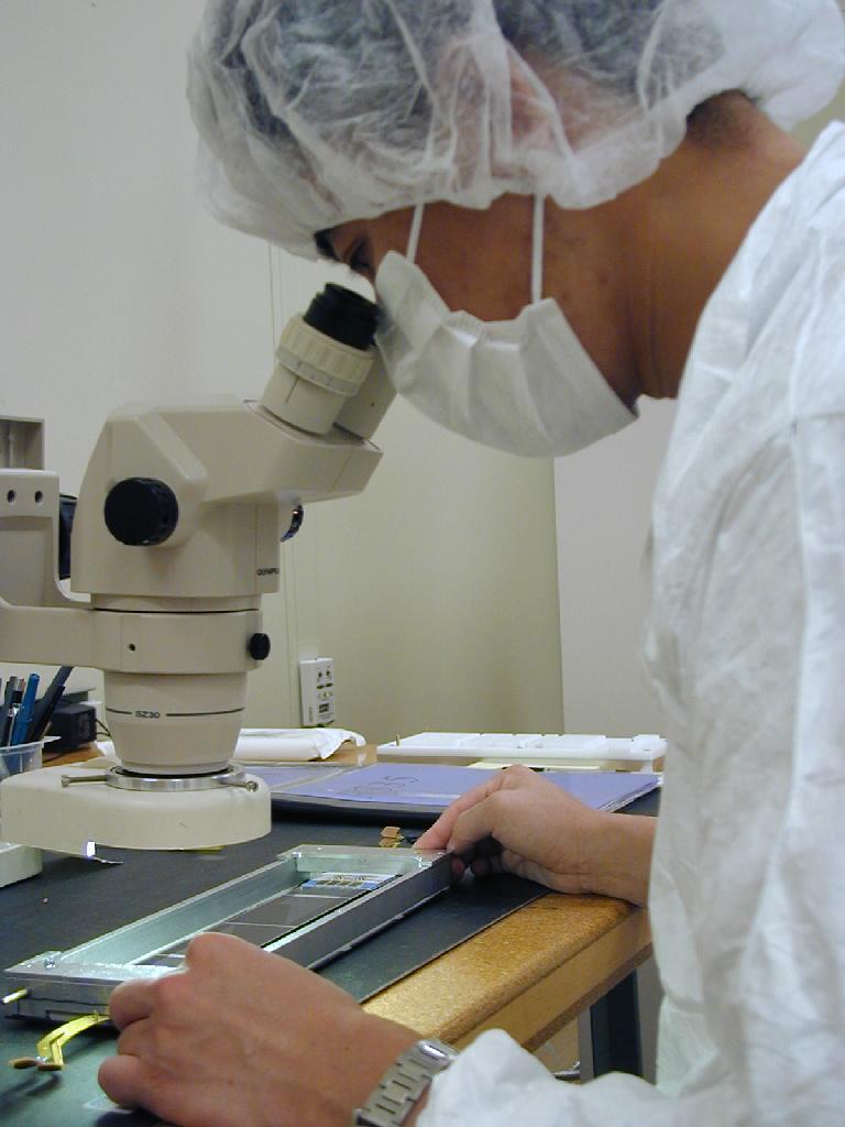 Dongwook Jang, graduate student at Rutgers, inspecting a Layer 4 ladder. The optical inspection of finished detectors spots flaws in fabrication before testing and burnin.
